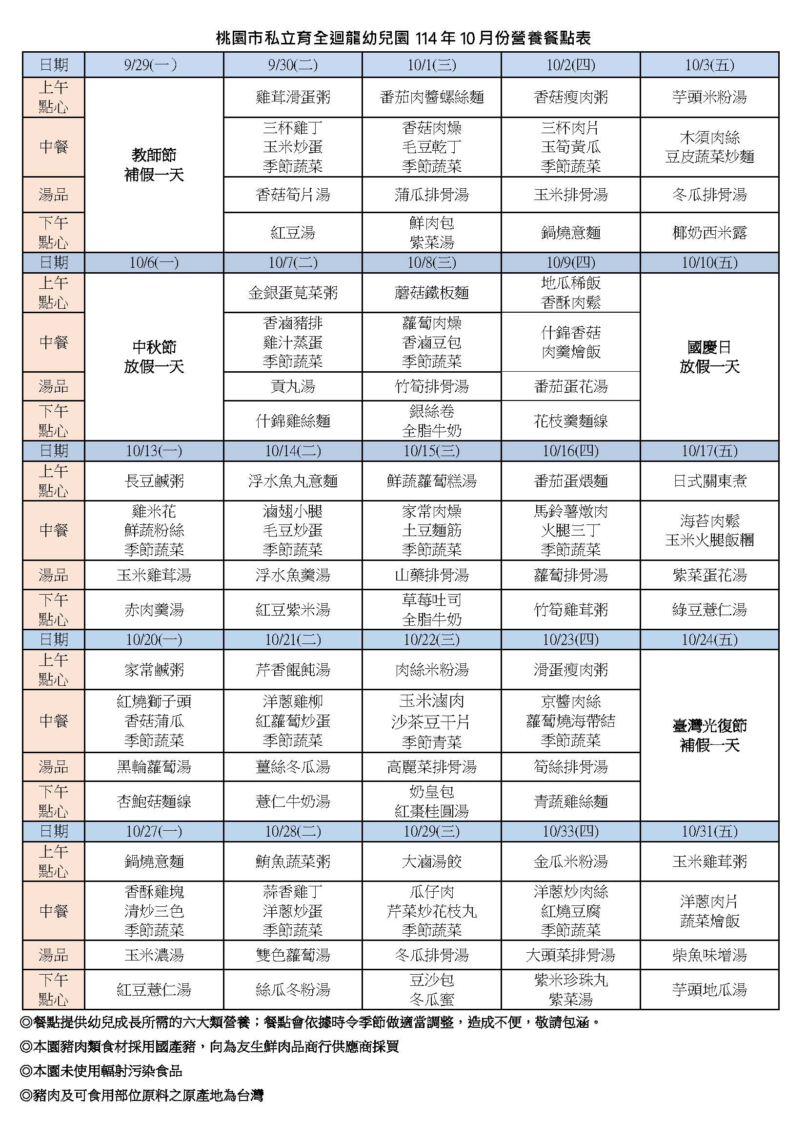 114年10月餐點表