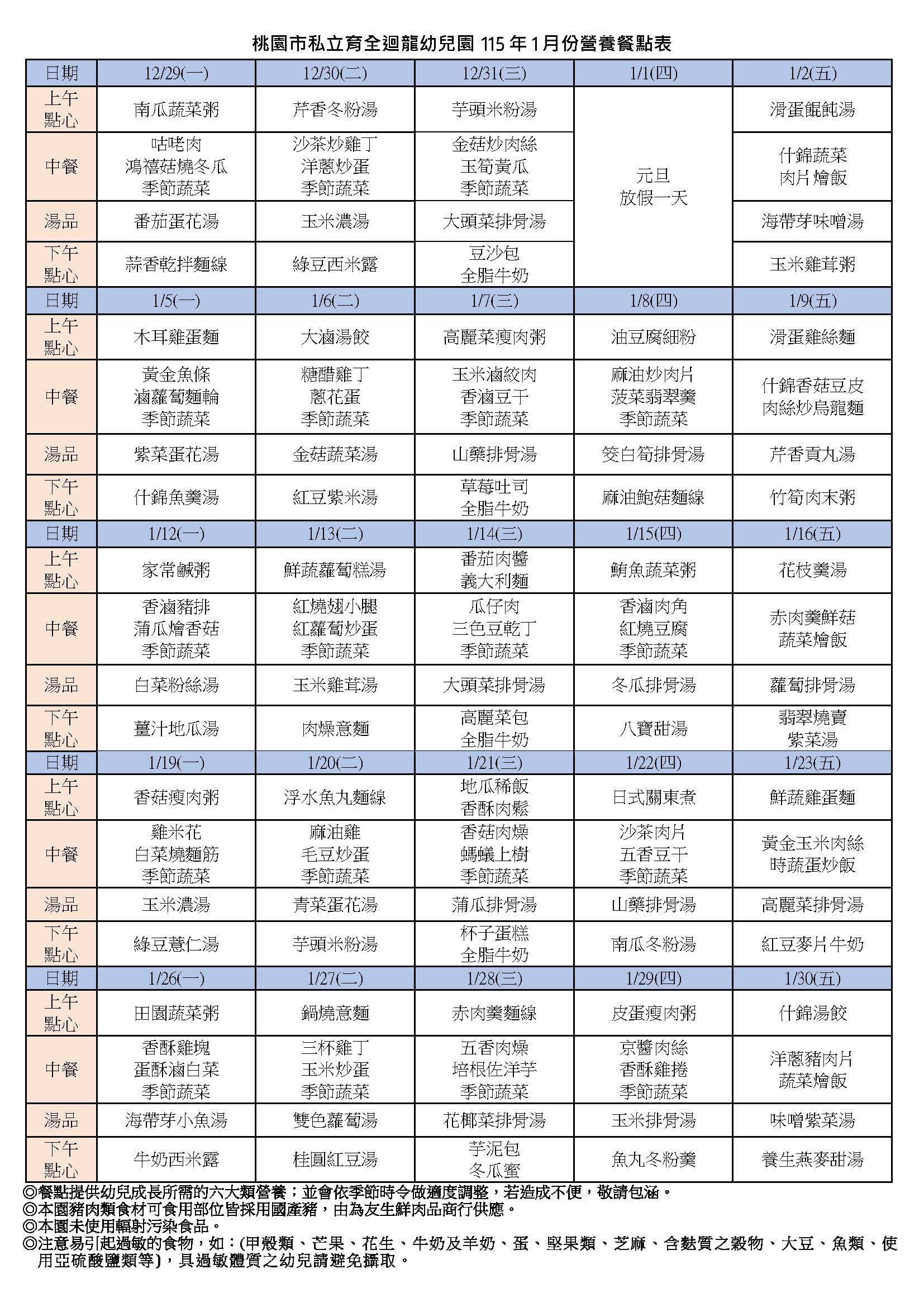 115年1月餐點表